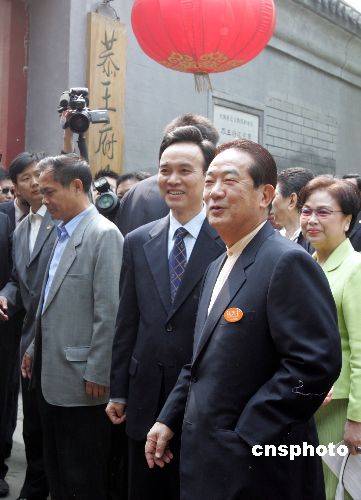 今日上午九時(shí)四十分許,四十余輛紅頂紅塌的人力三輪車隊(duì)搭載宋楚瑜一行,穿游什剎海的悠長(zhǎng)胡同,行抵恭王府。豪宅門(mén)側(cè)為愛(ài)新覺(jué)羅.溥杰所題:恭王府花園。宋楚瑜笑稱自己愛(ài)看《大宅門(mén)》等歷史劇,對(duì)老北京文化也素有好感,因此慕名而至。