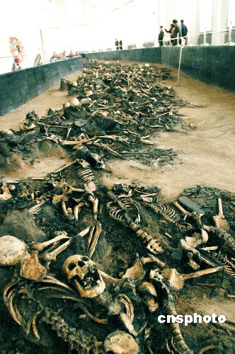 一九三二年九月十六日,只因一支襲擊日本侵略者的民眾抗日隊伍在頭一天夜里途經了撫順城南的平頂山村,日本侵略者就拿這里無辜的平民百姓作為報復對象:八百多間房屋、三千多中國居民被野蠻的屠殺,之后日軍還用汽油焚尸、放炮崩山,將全部尸首埋于山下,制造了震驚中外的“平頂山慘案”。圖為慘案現場建立的“平頂山慘案紀念館”內,展現的實地挖掘出的八百多具遇難同胞的骨骸、這些尸骨或呈現匍匐爬行、或依稀可見小生命在母親腹中掙扎的慘狀,再現遇難同胞臨死前的頑強與悲憤。作者:王麗南