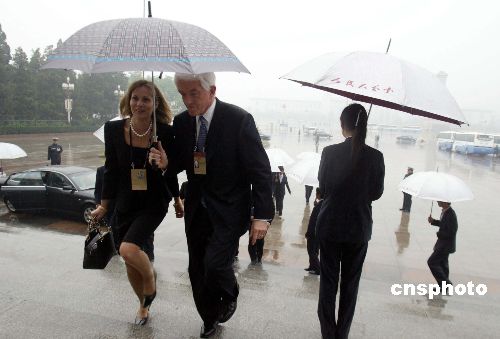 五月十六日晚,二○○五北京《財富》全球論壇在北京人民大會堂開幕。圖為參加開幕式的嘉賓冒雨抵達人民大會堂。作者:廖文靜
