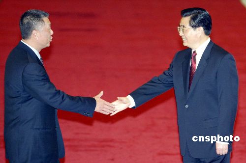 五月十六日晚,二○○五北京《財富》全球論壇在北京人民大會堂開幕。中國國家主席胡錦濤在開幕式前會見參會的VIP嘉賓。圖為會見時胡錦濤與澳門特區行政長官何厚鏵握手。作者:廖文靜
