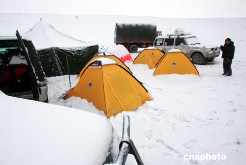 探險隊野外搭起橙色帳篷 風雪宿營(圖)