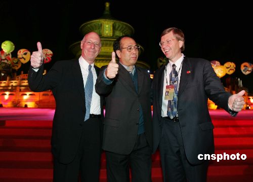 5月17日晚,北京市市長王岐山在天壇祈年殿舉辦歡迎《財富》論壇嘉賓盛宴后,全力投入籌備此次會議的國務院新聞辦主任趙啟正與美方客人共慶會議成功。作者:任晨鳴