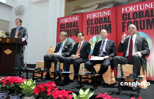 2005北京《財富》全球論壇5月18日專門舉行“中國銀行業改革近況”會議,中國銀監會主席劉明康(左三)、國家開發銀行行長陳元(右二)用嫻熟的英語坦誠地與麥肯錫公司亞洲區董事長鮑達民(左二)、安永會計師事務所合伙人羅德曼(右一)等人對話。作者:任晨鳴