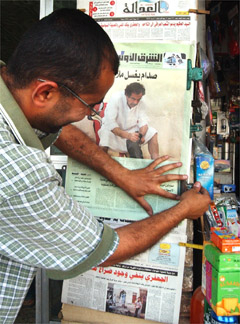 5月21日的英國《太陽報》再次刊登了薩達姆在獄中的照片,圖為伊拉克的報亭出售刊有相關圖片的報紙。 (春風)