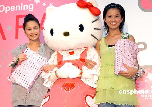 人氣偶像組合Twins兩名成員鍾欣桐(阿嬌)、蔡卓妍(阿Sa)5月24日在香港出席由Hello Kitty與OPA公司合作的女性品牌KI*LA*RA全港首間新店開幕,與Hello Kitty合影。作者:鄧慶樂