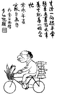 著名漫畫家方成有一幅“自畫自”的漫畫:一個大腦袋的方成,騎著一輛自行車,背后馱著一摞書,前面車筐里,插著幾支筆一卷畫。上題三句話:“生活一向很平常,騎車畫畫寫文章,養生就靠一個字,忙!边@是他對自己的生存狀態的自我描繪,走近他始知其言不虛。