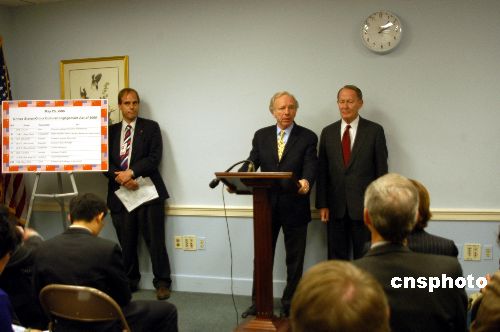 美國參議員喬.利伯曼(講話者)和拉馬爾.亞歷山大(前右一)二十五日聯合提出一項議案,要求美國聯邦政府從二00六年到二0一一年的五個財政年度內撥款十三億美元,全面促進美中在教育、學術、商業等方面的交流與接觸,并在美國中小學加強中文教育。作者:余東暉
