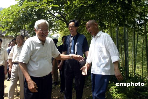六月四日,全國政協副主席、全國政協副主席、中國致公黨中央主席羅豪才,率領致公黨中央的部分領導和一大批專家學者、實業家,由中共中央統戰部副部長黃躍金以及當地領導的陪同下,到安徽省安慶市潛山縣茶莊村進行大別山區扶貧調研。圖為羅豪才(左)與當地村民笑談脫貧致富以及農村果樹種植。作者:盛佳鵬