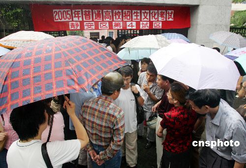 六月七日,二○○五全國高考在各地同時拉開帷幕,今年全國考生人數為八百六十七萬,上海有十一萬考生今起走進考場,一些家長等在考場外冒雨“陪考”。作者:湯彥俊