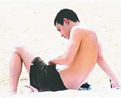 講完電話,他又做了快40分鐘的日光浴,才突然坐起身,出人意表地拉開短褲公然抓癢,可能是被螞蟻偷襲的關系。這一幕煽情又曖昧的畫面,就在海灘上活生生地上演,全被該媒體的狗仔隊給拍到了,讓陳冠希今年受人矚目的丑事,活生生再添一樁。