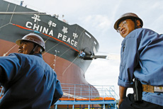 2003年6月,“中國航運股份有限公司”向上海外高橋有限公司訂造了兩艘17.5萬噸好望角型散貨船,今天命名交付的“中華和平”號便是其首制船。它比原定日期提前110天完工交船,并將于今天下午啟航向首航目的地、南非理查德灣進發。