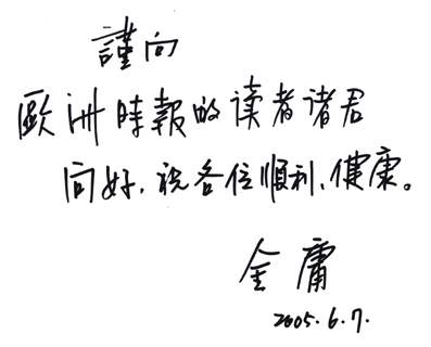 在見面會后,金庸欣然接受了歐洲時報的專訪,并給該報報題詞向讀者問好:“謹向歐洲時報的讀者諸君問好,祝各位順利、健康。”