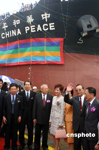 臺灣船東直接在祖國大陸訂造的第一艘船“中華和平”號十日在滬舉行盛大的命名交船儀式,圖為全國政協(xié)副主席董建華、中國國民黨主席連戰(zhàn)夫人連方瑀女士等專程趕來見證海峽兩岸這一重要的歷史性時(shí)刻,并在“中華和平”號前合影留念。作者:孫自法