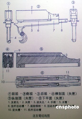 弩機示意圖。弩機是具有遠射和殺傷力較強的武器,它的構造分矢匣和機體兩部分。機件為銅質,矢匣用楠木雕制,呈長方形,前端下緣有兩個并列的半圓形發射孔。匣內有三個儲存矢的槽,兩側為豎槽,可儲矢九枝,中間為水平槽,可并列放置二內。?