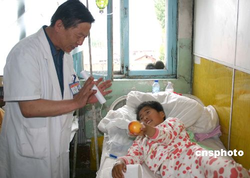 截至六月十四日,在黑龍江寧安特大山洪災害中被救出的十七名學生已基本康復。但學生心中仍存恐懼與陰影,為此醫(yī)生通過聊天、玩游戲等方式對學生進行心理疏導。圖為一名學生聽完專家的笑話,高興地將蘋果送給專家。作者:吳兆飛