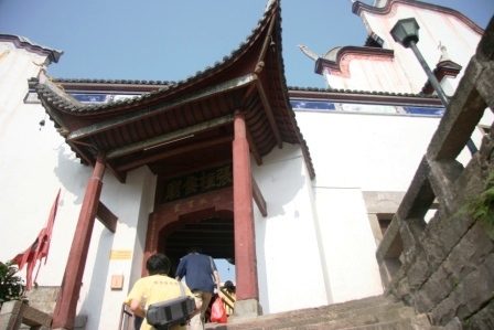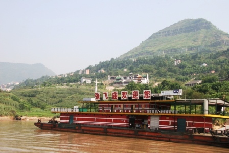 筆者一行自云陽(yáng)新城的南岸驅(qū)舟,橫穿長(zhǎng)江抵達(dá)南岸的張飛廟碼頭。船行長(zhǎng)江,江上風(fēng)清日烈。談笑間,舟已至南岸。棄舟登岸,拾階而上。路陡且窄,兩邊多仿古店肆,店家小販叫賣(mài)不斷。烈日如炙,同行者皆汗流夾背。