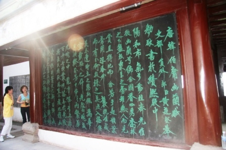 廟內(nèi)現(xiàn)存石碑和摩崖石刻及木刻書(shū)畫(huà)多達(dá)數(shù)百幅,書(shū)畫(huà)作品遠(yuǎn)自漢唐近至明清各代,名家薈萃,實(shí)為罕見(jiàn)。其中以木刻顏真卿書(shū)《爭(zhēng)座位帖》;石刻蘇軾作前、后《赤壁賦》大字長(zhǎng)卷;石刻岳飛書(shū)諸葛亮前、后《出師表》;黃庭堅(jiān)書(shū)《唐韓伯庸幽蘭賦》;鄭板橋書(shū)寫(xiě)的詩(shī)文和竹石、蘭石繪畫(huà)等最為著名。此外還有劉墉、張船山、竹禪、彭聚星龔睛碑、趙熙、郭尚元、張潮庸、劉貞安等人的木刻字畫(huà),琳瑯滿(mǎn)目,美不勝收。