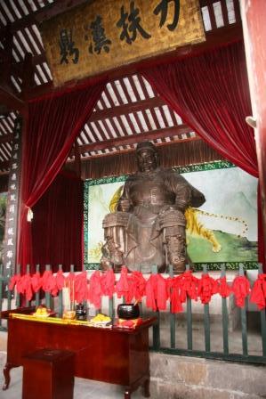 大殿銅像上面,懸掛了“力扶漢鼎”的牌匾。銅像前,游客多將紅布結(jié)系到銅像前的欄桿上,祈求平安。此間百姓將張將軍奉為神明,船夫漁民更是虔誠(chéng),張飛生日、逢年過(guò)節(jié)都要焚香供奉。傳說(shuō)張飛在云陽(yáng)幾次顯靈,除了那次讓張鵬翮膜拜,還有一次是明末張獻(xiàn)忠率大軍沿長(zhǎng)江進(jìn)軍四川,張飛一腳立江中,一腳立云陽(yáng)縣城,不讓張獻(xiàn)忠入川。張飛在長(zhǎng)江上便名聲大噪,成了保佑過(guò)往船只一路平安的神靈。