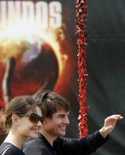影星湯姆克魯斯(Tom Cruise)6月21日與訂婚女友凱蒂荷姆斯(Katie Holmes,左)一同出席電影《世界大戰》(又譯強戰世界,War of the Worlds)在馬德里的首映會,該片將自6月29日上映。阿湯哥于17日選在浪漫的巴黎艾菲爾鐵塔向凱蒂求婚,結束外界對兩人是否有意結婚的臆測。(圖片來源:路透社 記者:Susana Vera )