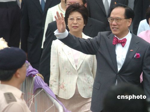 中新社香港七月一日電(記者文青)今天是香港回歸八周年,灣仔金紫荊廣場舉行升旗儀式,曾蔭權首次以行政長官身份,聯同剛獲委任為政務司司長的許仕仁,以及其他特區主要官員出席儀式,另有二千五百名嘉賓應邀出席,近一千名市民在場觀看,場面盛大和熱鬧。
