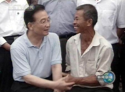 在蒼梧縣龍圩鎮中村,溫家寶深入田間地頭查看災情,與農民促膝交談。