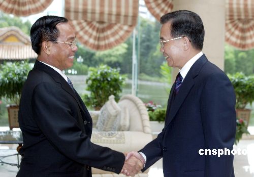 溫家寶會見參加大湄公河次區域經濟合作第二次領導人會議的老撾總理本南。作者:廖文靜