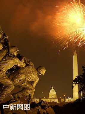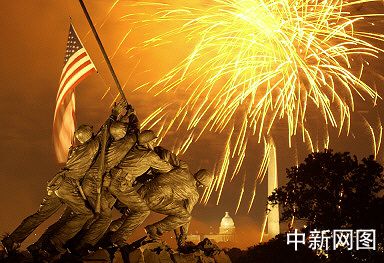 7月4日,圖為在美國費吉尼亞州阿林頓國家公墓的美國海軍陸戰隊紀念碑上空,紀念美國獨立日的煙火表演照亮夜空。