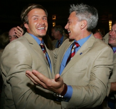 在得知倫敦申辦奧運會成功后,英格蘭隊隊長大衛·貝克漢姆和奧運會金牌得知愛德華茲一起慶祝。經過四輪的投票,倫敦在最后一輪中以54比50擊敗了巴黎,獲得奧運會的主辦權。圖據路透社