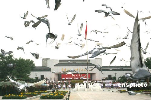七月七日,“偉大勝利——紀念中國人民抗日戰爭暨世界反法西斯戰爭勝利六十周年大型主題展覽”在北京中國人民抗日戰爭紀念館正式開展。展覽共選用文物八百余件、照片六百余張、圖表近四十件,有大量的歷史資料、其中的一百四十一件文物為首次披露。圖為開展儀式上和平鴿飛翔。作者:盛佳鵬