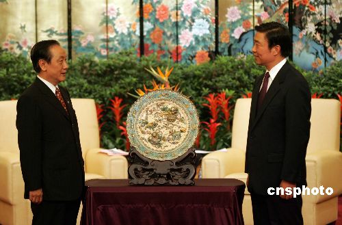 李源潮向新黨大陸訪問團(tuán)贈送了兩件禮物,一件是云錦“金絲盤龍”,另一件是金箔制作的《論語》。郁慕明贈送給江蘇的仍舊是一個(gè)交趾燒陶盤,主題是“祥獅獻(xiàn)瑞”,寓意團(tuán)圓和緣分。