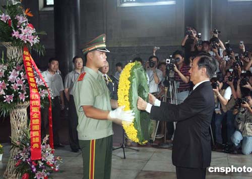 臺灣新黨主席郁慕明率領的臺灣新黨“民族之旅”訪問團七月八日在南京拜謁中山陵敬獻花圈。作者:毛建軍