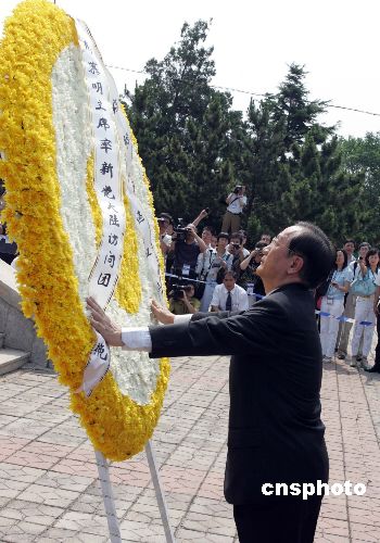 圖:郁慕明向大連萬忠墓敬獻花圈