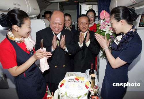 七月十日,南航機組人員在臺灣新黨“民族之旅”訪問團從大連飛往北京的途中,送上蛋糕,祝賀新黨秘書長李勝峰(左二)生日快樂,并祝訪問成功。作者:毛建軍
