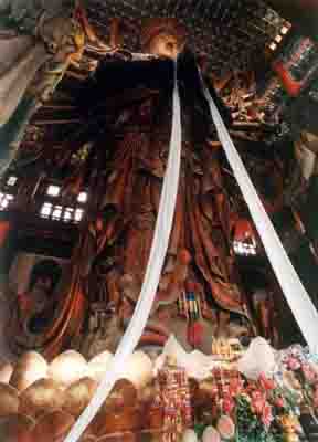 普寧寺讓人記住的另一個(gè)原因即是其主殿——大乘之閣陳列的世界最大金漆木雕佛像——千手千眼觀世音菩薩像。佛像高23。511米,腰圍15米,重達(dá)110噸,僅頭部就重達(dá)5噸,用去松、柏、榆、椴、杉五種木材共120立方米。