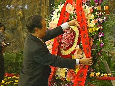 7月11日,新黨大陸訪問團參觀抗日戰爭紀念館。圖為新黨主席郁慕明向抗戰紀念館敬獻花圈。(央視截圖)