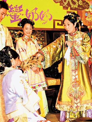 中新網(wǎng)7月13日電 據(jù)香港《大公報(bào)》報(bào)道,“無(wú)線”將于下周一推出新劇《我的野蠻奶奶》,昨日一班演員包括汪明荃、胡杏兒、黃宗澤及伍詠薇等,特地穿上清裝到珍寶海鮮舫舉行“新抱入門儀式”宣傳活動(dòng)。期間“阿姐”、杏兒及Bosco(黃宗澤)除了Rap唱主題曲之外,“阿姐”更如野蠻奶奶“上身”般,向杏兒訓(xùn)示媳婦入門家規(guī)時(shí)喝令她跪下,之后送杏兒繡花鞋、樹葉及雞毛掃,“阿姐”道:“送樹葉是希望你開枝散葉,我看你晚晚都沒空。”而杏兒也不是好欺負(fù),斟茶時(shí)即對(duì)“阿姐”道:“小心嗆到!”