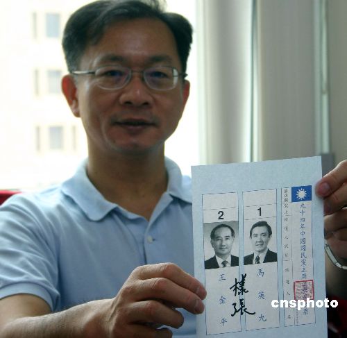 七月十三日,二00五年中國國民黨主席選舉選票印制完畢并封存于該黨中央黨部。圖為國民黨組織經營部主任黃重憲展示選票樣張。作者:劉舒凌