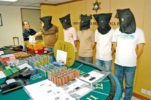 澳門治安警情報廳探員在酒店及關閘先后拘捕五名廣州男子,搗破運作超過兩個月的假賭場,搜出兩張可隨時組合的賭臺、面值超過三千一百萬元假籌碼,以及大批賭具,相信是澳門有史以來使用道具最多、規模最大的天仙騙局。警方相信尚有五至七人在逃,正全力追緝歸案。