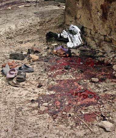 中新網7月14日電 據路透社報道,7月13日,巴格達發生一起汽車自殺炸彈爆炸事件,造成至少25人喪生,25人受傷,死者中包括許多兒童。圖為炸彈襲擊后,巴格達的街道上遺留的血跡和鞋子。(春風)