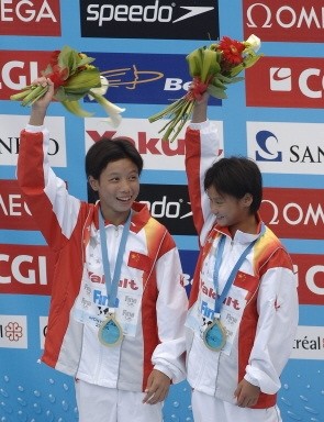 正是這兩個不起眼的中國女孩今天在世界游泳錦標賽上一鳴驚人,將本屆大賽的首枚金牌--女子雙人十米臺金牌收歸中國隊賬下。賈童、袁培琳這兩個陌生的名字讓一位現場播發消息的外國記者頗費了一番周折。
