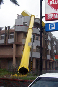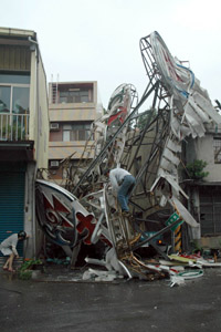 高雄縣橋頭鄉一座大型鐵制廣告廣告牌被強風吹倒,壓到對面民宅。