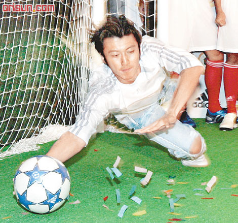 中新網7月19日電 據香港媒體報道,謝霆鋒昨日在灣仔出席某活動,同場還有將于本月底迎戰“紅魔”曼聯的港隊球員,雖然霆鋒手腳舊患仍未痊愈,但他仍到場做守門員,更不惜飛身擋截港隊球員的射球,背脊還撞向門柱,結果成功阻截港隊射球,表現相當賣力。