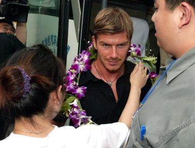 北京時間周三凌晨,西甲豪門皇家馬德里一行抵達北京,開始為期四天的中國之行。圖為在走出機場時,貝克漢姆受到球迷的追捧。