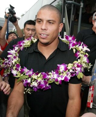 北京時間7月20日凌晨,西甲豪門球隊皇家馬德里飛抵北京,開始對中國進行為期四天的訪問。圖為羅納爾多帶上中國方面獻上的花環(huán)。