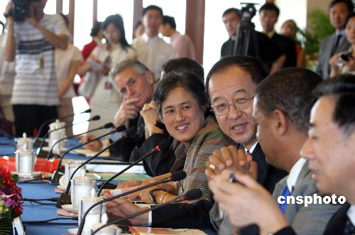 七月二十一日,世界漢語大會進入第二天,在北京飯店第一分會場,國家對外漢語教學領導小組副組長、國務院僑辦副主任劉澤彭同與會各國政要熱情交談。作者:張勤