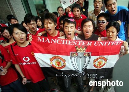 英超豪門曼聯隊昨日抵達北京,開始他們的中國之行。在未來的幾天中,他們將與中國的球迷以及媒體見面,并將與北京現代隊進行一場友誼賽。圖為曼聯球星抵達北京后,中國球迷熱烈歡迎。