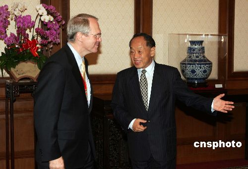 中國外交部長李肇星七月二十五日在北京釣魚臺國賓館會見并宴請前來出席朝核問題六方會談的美國國務院助理國務卿希爾。作者:毛建軍