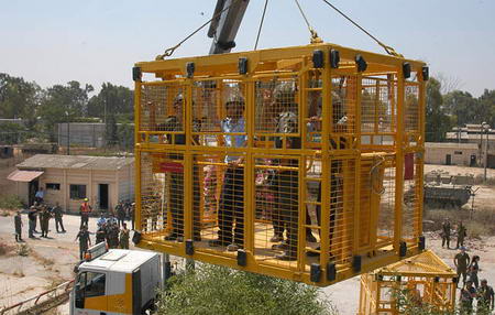 扮演拒不撤離的猶太定居者的警察被關(guān)進(jìn)鐵籠