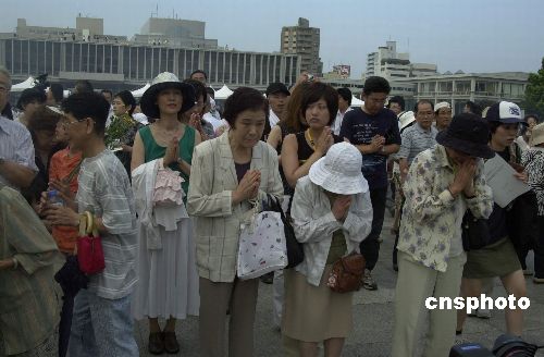 八月六日一大早,眾多日本廣島市民紛紛來到留有原子彈爆炸遺址的和平紀念公園,悼念當年原子彈爆炸中的死難者。六十年前的這個日子,廣島遭受了人類歷史上第一枚原子彈襲擊。作者:王健