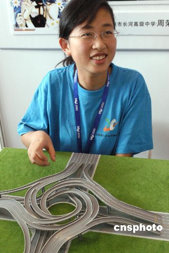八月六日,杭州中學(xué)生周榮姝設(shè)計的互通式立交橋模型在北京舉行的“第二十屆全國青少年科技創(chuàng)新大賽”上展出。周榮姝的設(shè)計方案具有占地面積小、造價低、可靠性高的優(yōu)點。作者:鄒憲